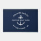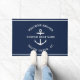 Doormat náutico en azul marino que dice "bienvenido a bordo", así como el nombre y la ubicación de tu personalizado.