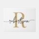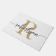 Alfombra personalizada elegante moderna y femenina con iniciales de monograma en blanco y dorado. Este diseño presenta un nombre de familia en una bonita caligrafía con cola de florituras (o tipografía) con inicial de monograma en dorado y negro sobre fondo de color blanco. Gran regalo elegante y femenino para inauguración de hogar, también para cumpleaños, boda, aniversario, despedida de soltera, recién casados, fiesta de soltera y es para la chica que le gustan las cosas minimalistas limpias.