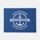 Estera de puertas con ancla náutica blanca rodeada de un borde de cuerda sobre un fondo azul oscuro. Al otro lado del ancla hay un cartel azul claro con el texto de personalizable "bienvenido a bordo". Añade el nombre del barco y el puerto de llamada.