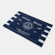 ¡Bienvenidos a bordo! Doormat náutico leyendo el nombre de tu barco personalizado rodeado de una brújula con un ancla sobre las modernas franjas azul marino con gaviotas, así como una segunda línea de texto lista para ser personalizada.