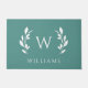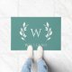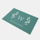 Moral azul turquesa Wreath Monograma inicial Apellido Doormat presenta laureles dibujados a mano sobre un fondo turquesa, con su nombre familiar e inicial.