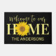 Texto amarillo claro "Bienvenido a nuestro hogar" con un girasol amarillo reemplazando la letra O, y un nombre de familia personalizado sobre fondo negro.