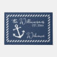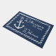 Hermosa estera de puerta de temática náutica con ancla blanca y patrón de borde rayado. Con espacio para el personalizar o personalización con el apellido familiar y fecha establecida del año de su elección. Disponible en una variedad de modernos acentos decorativos y accesorios de moda para decorar un patio, porche o espacio exterior en la terraza de la piscina.