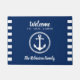 "Bienvenido a nuestra cabina" Doormat, con su apellido personalizado. Con una Moda moderna de anclaje náutico en el hermoso azul marino.