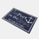 Doormat azul marino náutico con la frase "Nuestro puerto en la tormenta" en letras blancas incluyendo tu apellido personalizado.