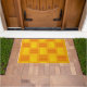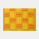 Este felpudo tiene un diseño moderno de mediados de siglo que parece un tejido de líneas rojas y amarillas en un campo de oro.