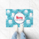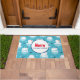 Una alfombra de la puerta de Navidad de Feliz con un lindo patrón de Navidades con osos polares parados en hielo flotante usando sombreros de santa roja. Pequeños iglús, copos de nieve y peces rodean a estos adorables osos polares escalofriantes en el agua. Fondo azul claro. Un círculo blanco con un borde azul sobre la superficie, con Feliz Navidad escrito en su interior. Un diseño vacacional agradable y caprichoso.