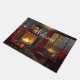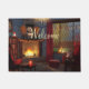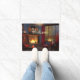 Un acogedor rincón de lectura en un día lluvioso de otoño. Alrededor de la chimenea hay unos sillones rojos mullidos, con pilas de libros y tartas y una tetera para completar el confort. En el exterior, un sauce amarillo y una cubierta roja de arce y hayas se ven oscurecidos por la lluvia que sopla la ventana, donde un gato jengibre se sienta mirando hacia afuera.