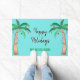 Esta divertida alfombra de puertas festiva está decorada con palmeras acuáticas y Navidades con luces de fondo turquesa. Personalice esta alfombra con su nombre y cambie el saludo si lo desea. Acuarela original © Michele Davies.