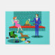 Este par retro con la estera de puerta del perro parece una escena fuera de una comedia romántica. El estilo de los años 60, características del diseño minimalistas del arte un par atractivo que disfruta de una igualación romántica en casa. El cuarto sofisticado ofrece prominente la aguamarina y la chimenea verde azulada del ladrillo con una repisa roja brillante. Un hermoso, mujer del redhead que lleva un brillante, vestido del rosa se encarama en la repisa. Ella está gozando de un martini con una aceituna flotante, un fuego del rugido, buena música, y la compañía un hombre alto, oscuro y hermoso. El hombre está llevando un juego azul y un lazo rojo. Su vidrio de martini se aumenta para tostar a su compañero encantador. En su otra mano, él está sosteniendo un álbum de disco de vinilo. En sus pies, vemos un dachshund más adorable el llevar de un cuello rojo. El perro juguetón de la salchicha de Frankfurt está caminando en dirección de un tocadiscos verde con el naranja, piernas del eje. En el piso, hay un grupo colorido de diversión, ecléctico, discos de vinilo. ¡Alegrías! Aquí está a la igualación perfecta en casa.