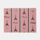 Ilustracion de París con Torre Eiffel y decoración del corazón y diseño de texto de París sobre fondo rayado negro, blanco y rosa