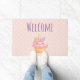 Doormat de bienvenida con un dibujo acuarela de un quequito con hielo rosa, un cuerno de unicornio y rosas coloridos.