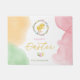 Colorful Easter design featuring Destei's watercolor illustration of a yellow baby chick nestled inside a willow wreath. The wreath is decorated with colorful pastel Easter eggs. The background includes lovely watercolor splashes in light orange, green and pink. The text sections appear in different pastel tones, enhancing the overall pastel theme. Three pastel Easter eggs sit along the bottom as an additional detail. Personalize with custom family name!