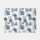 Diseño náutico de fondo azul y blanco con decoración de velero, brújula, ancla y rueda de vela