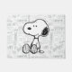 Esta obra de arte de Peanuts muestra a Snoopy sentado en el fondo de tiras cómicas Charles M. Schulz en blanco y negro.