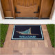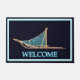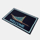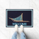 Un perro corría con una bolsa de trineo verde azulada sobre un fondo estrellado junto con texto que decía "BIENVENIDOS" en azul y blanco resplandeciente. Puede personalizar esta alfombra de bienvenida agregando su propio texto en la bolsa de trineo