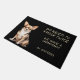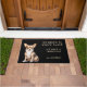 "No hay necesidad de llamar dos veces, tenemos un Chihuahua" declara esta graciosa alfombra de puerta. El texto está en un tono pálido en el lado derecho, mientras que una imagen de un adorable perro chihuahua está a la izquierda. Todo está colocado sobre un fondo negro.