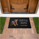 "No hay necesidad de llamar dos veces, tenemos un Doberman" declara esta graciosa alfombra de puerta. El texto está en blanco en el lado derecho, mientras que una imagen de un adorable Doberman Pinscher está a la izquierda. Todo está colocado sobre un fondo negro.