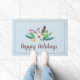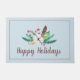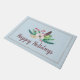 El doormat festivo Festive front cuenta con un ramo de estilo Boho con ramas de abeto, plumas, azulejos, bayas y flores blancas con fondo azul. Personalizar con nombre, mensaje estacional u otro texto festivo