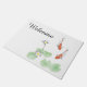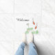 Un felpudo blanco con una idílica pintura de la acuarela Zen de dos koi en un estanque koi con nenúfares blancos y toallitas de nenúfares, con la palabra personalizable "Bienvenidos" a la izquierda.