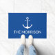 Personalizado Náutico Nombre Barco Anuncio azul Doormat ancla blanca. Personalizar de texto náutico de navegación, nombre del capitán. Nombre del barco, tienda, nombre comercial. diseño minimalista, sencillo y elegante, ideal para marineros, barcas, vela y paseos en bote. ¡Feliz navegación!