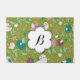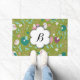 Bonito, colorido, lindo, caprichoso describe nuestro maravilloso doormat de diseño de Tweety Birds on Vines. Pequeños pájaros de verde azulado, vino, blanco y rosado sobre viñas acuáticas con flores blancas, remolinos rosas, todo sobre un fondo verde. Esta divertida y colorida alfombra de puerta presenta un banner con forma de flor blanca que puedes personalizar fácilmente con tu primer monograma.