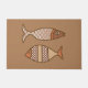 Doormat en un patrón de pescado retro, moderno, caprichoso, en tonos tostados, rojos, beige, marrón y blanco, sobre fondo marrón de cacao claro