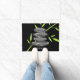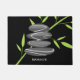 Piedras zen de guijarros apiladas y diseño de alfombra de puerta interior / exterior con hojas de bambú verdes.