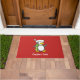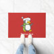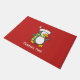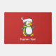 Un pequeño pingüino personalizado con sombrero de santa y bufanda verde caminando sobre la nieve.