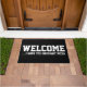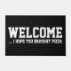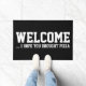 "Bienvenida... Espero que hayas traído pizza" alfombra de bienvenida con fondo negro. Perfecto para cualquier amante de la pizza.