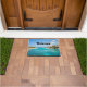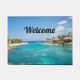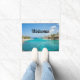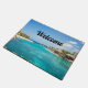 Un felpudo con una hermosa foto de un complejo de playa tropical. agua azul bonito y playa de arena blanca con cabañas de paja que le confieren un ambiente tranquilo a la isla.