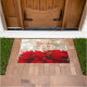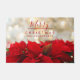 Un felpudo personalizado con una fotografía festiva con un ramo de poinsettias rojas en el fondo. Luces de bokeh doradas brillantes en el fondo. Elegante y sofisticado. Tipografía navideña escrita con un moderno tipo de letra roja.