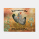 Casa de campo negra y blanca pollos tonos marrones y vida vegetal. texto y nombre del personalizar.