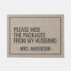 Este divertido diseño de felpudo muestra las palabras "Por favor, esconda los paquetes de mi marido". Personalice esta bonita alfombra rústica de puerta burlap con su nombre familiar y el saludo personalizado. El perfecto y moderno hogar cálido o el nuevo regalo de los propietarios.