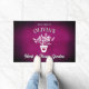 Personalized welcome mat in a bright pink with a white potted floral with a cute heart on the pot, and white text to really stand out to welcome all your garden guests.