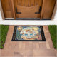 Doormat de bienvenida con la princesa de jengibre moderna con diadem en la playa cogidos de la mano de su príncipe y niñas pequeñas tirando flores - felpudo familiar enmarcado en estilo Art Nouveau con pavo real y rosas. Fabuloso regalo de arte para tu casa de playa, pareja recién casada, aniversario familiar. Texto fácilmente personalizar por los lados.