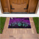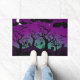 Dombardía de Halloween morado y azul acuático. Un cementerio embrujado en morado y agua con tumbas, árboles espeluznantes, una bruja, un búho, murciélagos y tu texto "Feliz Halloween" son los elementos de este diseño de Halloween fresco.