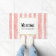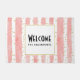 Bienvenido al Doormat con un patrón elegante. Con franjas de color rosa y un purpurina de confeti de oro falso diseminado por todos lados. Un cuadrado blanco con un falso borde de Relieve metalizado dorado sobre la parte superior, con tu texto personalizado dentro.