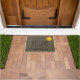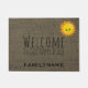 País lindo, mirada rústica de la arpillera, doormat personalizado perfecto para una cabina en las maderas Brown, falso fondo de la textura de la arpillera rústica lamentable. Apellido personalizado en la parte inferior en letras negras, elegantes. Lee, "dé la bienvenida a nuestro lugar feliz" en letras rústicas en el centro. Un sol del kawaii en la esquina superior sonríe en los visitantes. Recepción rústica, de la diversión para la familia y huéspedes. Moda del país, regalo con monograma del estreno de una casa para la familia o regalo único de la ducha del boda para los recienes casados. Nota: Se imprimen todas las imágenes. Arpillera no real.