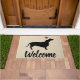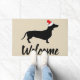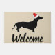 Dachshund del navidad que lleva un gorra y la palabra "recepción" de santa. ¡Este doormat también haría un gran regalo para nuevamente se casa o los nuevos dueños caseros!