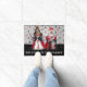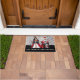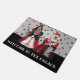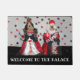Esta estera de puerta ofrece los perros perdigueros de oro vestidos como el rey y la reina de corazones. El texto lee, "dé la bienvenida al palacio".