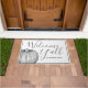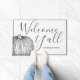 Doormat gris y blanco del estilo rústico del cortijo con las palabras "recepción, usted" en escritura fina. Personalizó el su apellido.