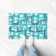 Este doormat tiene un diseño moderno de mediados de siglo de rectángulos abiertos en rectángulos azules sobre rectángulos abiertos en el color azul óvulo de robin.