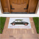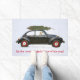 Perro recuperador de oro conduciendo un auto negro retro en copos de nieve con Navidades verdes de pino en el techo.
