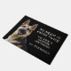 "No hay necesidad de llamar dos veces, tenemos un pastor alemán" declara esta graciosa alfombra de puerta. El texto está en un tono pálido en el lado derecho, mientras que un retrato de un hermoso GSD está a la izquierda. Todo está colocado sobre un fondo negro.