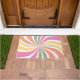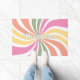 With a retro twist, personalize your doormat with a 70s inspired, colorful sunburst. The family name or other custom text is in layers, with the top layer being outlined text. The sunburst features white, orange, yellow, pink, and green colors.