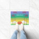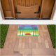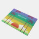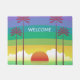 Modern colorful personalised mat with retro style sunset and palm trees art.