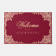Un diseño elegante de color burgundy y rosa con ramas intrincadas con hojas de oro rosa en las esquinas. La palabra Bienvenidos también está en caligrafía de oro rosa, el apellido debajo en mayúsculas. El texto es "Bienvenidos a los [Apellido]". El fondo es burgundy.