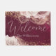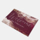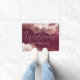 Esta alfombra de puerta personalizado tiene un glamuroso tema vintage de cuento de hadas. El fondo es un terciopelo de color burdeos con rosas acuarelas con acentos purpurinas. Los rosas románticos de color ruidoso son retratados con patrones de tinta y acentos purpurinas de oro de imitación de glam. Las luces de cuerda acentúan las flores en la parte superior.