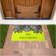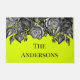 Esta elegante alfombra de bienvenida está lista para ser personalizada con el nombre de su familia o cualquier texto que desee. Este doormat presenta ilustraciones de rosas negras y blancas en un estilo antiguo de grabado, con un fondo verde limón eléctrico brillante.